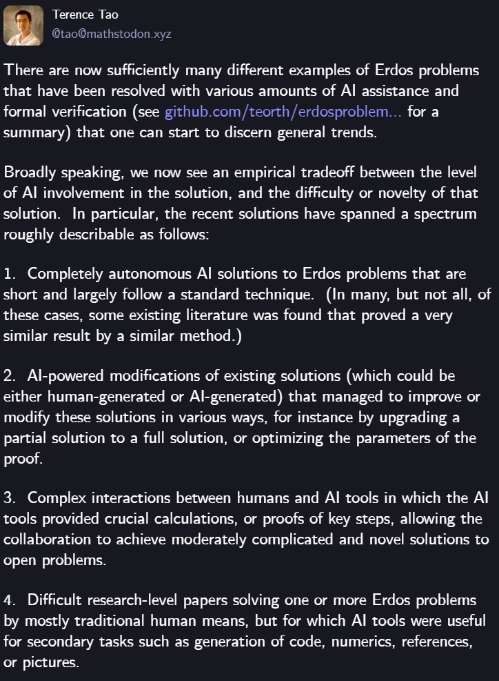 「这些相对容易的Erdős题目,未来更可能由AI纯自主解决,而非人类或人机合作。」他补充道。