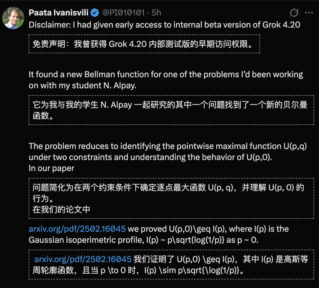 与此同时,马斯克的Grok 4.20也不装了,被曝在5分钟内「秒杀」了困扰教授们许久的Bellman函数难题。