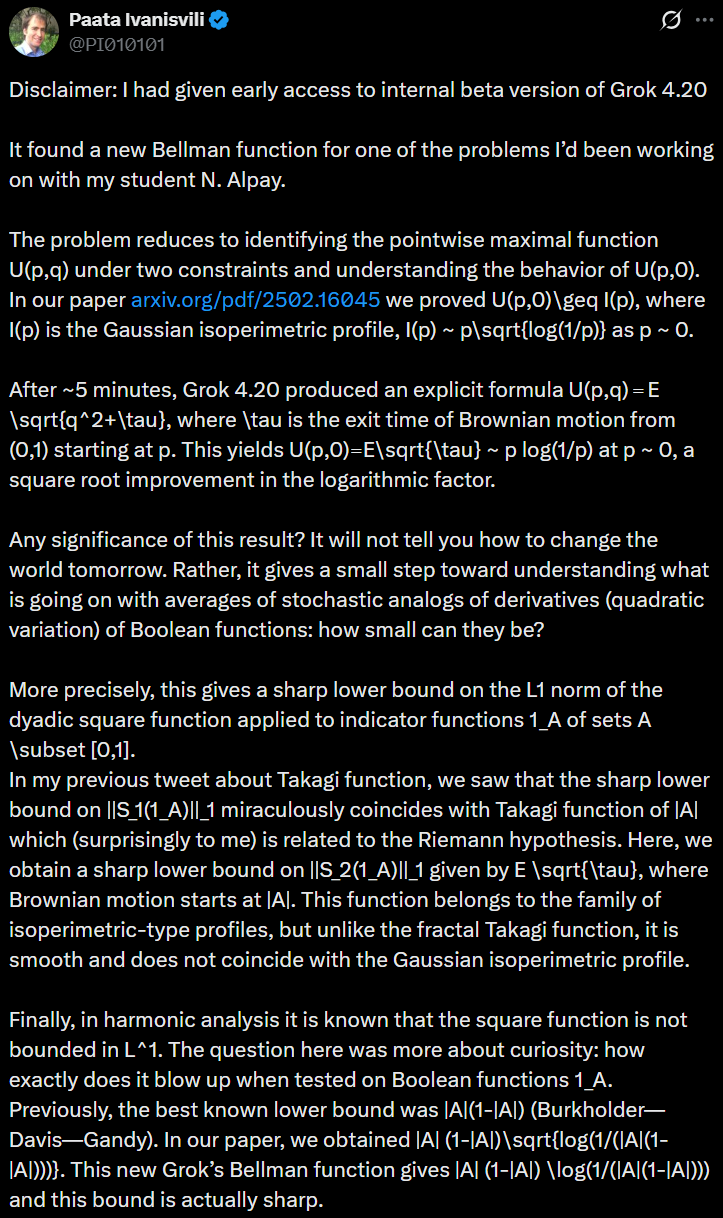 无独有偶,加利福尼亚大学尔湾分校数学系教授Paata Ivanisvili,也提前拿到了Grok 4.20内部测试版的访问权限。