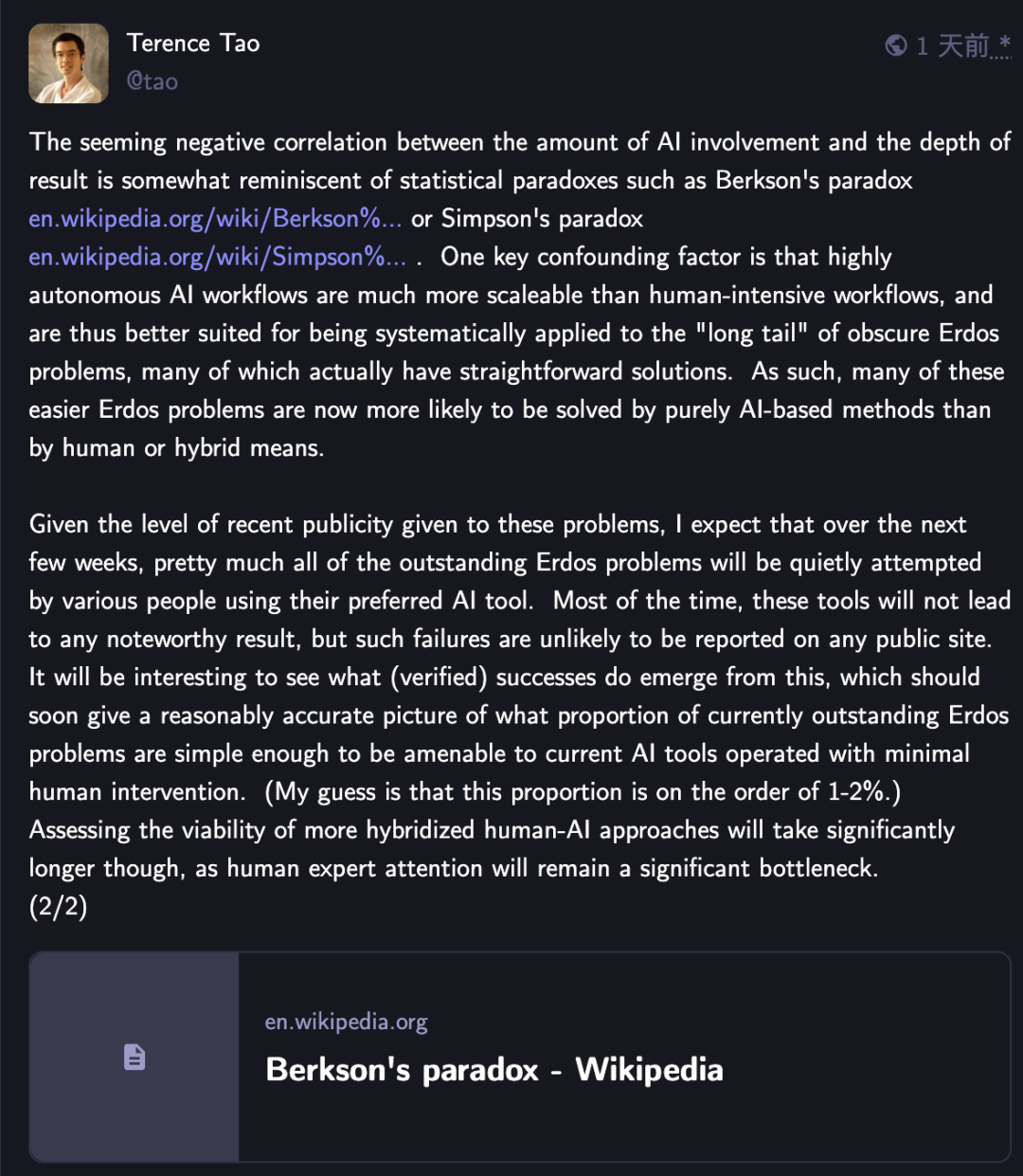 他个人猜测,大概在1%到2%目前尚未解决的Erdős难题中,能在几乎不依赖人类干预的情况下,被现有AI工具直接攻克。