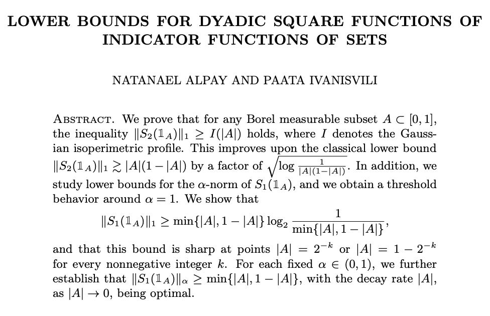 🥈 银牌(教授团队):Ivanisvili 团队费劲心力,把它推进到了 |A| (1-|A|)\sqrt{\log(\dots)}的级别。