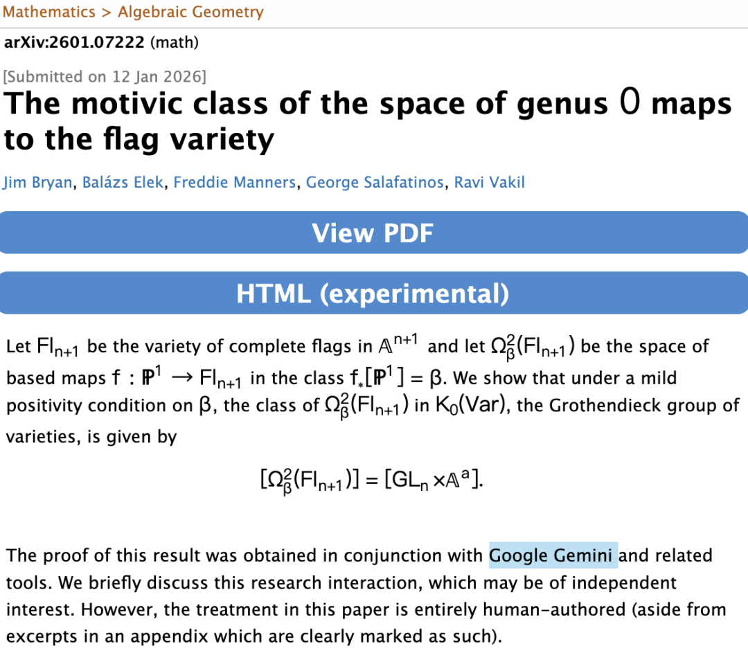数学家Ravi Vakil等四人,发表的这篇论文标题为:THE MOTIVIC CLASS OF THE SPACE OF GENUS 0 MAPS TO THE FLAG VARIETY「旗空间上的亏格零映射的Motivic类」。