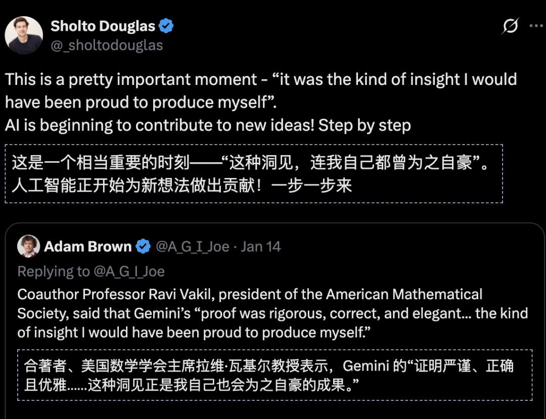 而这次他最大的收获是:重要的数学进展,来自人类智慧与 Gemini 贡献之间的真实协同。