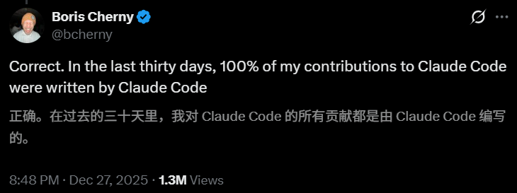 Claude之父Boris Cherny半开玩笑地说,他过去三十天的代码贡献,100%都是由Claude Code完成