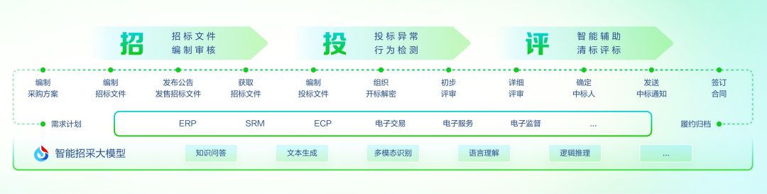 一方面,大模型提供了强泛化的理解与推理能力,能把招采复杂场景先跑通;另一方面,垂类模型和智能体钉进具体环节,让LLM在真实业务中获得高密度的反馈。