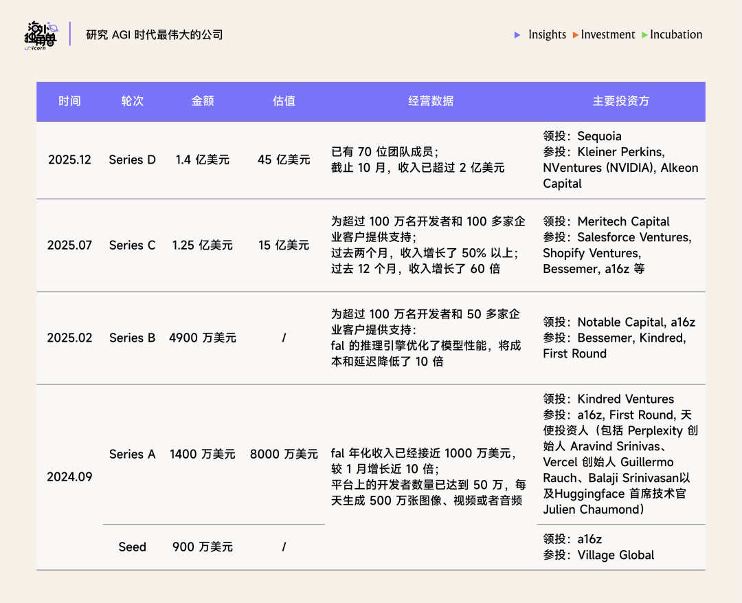 fal 是一家为开发者和企业提供高性能的 AI 生成媒体平台的 infra 公司,通过 API 和云端加速引擎让图像、视频、音频等 AI 模型能快速推理和部署。2025 年 12 月,fal 完成了 1.4 亿美元 D 轮融资,由红杉资本领投,凯鹏华盈、英伟达等跟投,公司估值达到 45 亿美元。