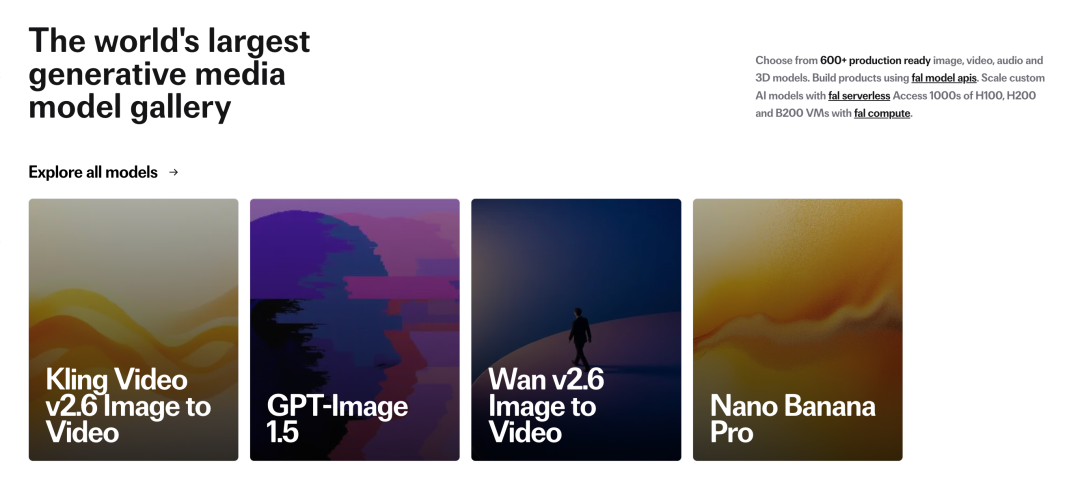 平台上托管了数百个先进模型,包括 DeepMind(Veo)、Kling、MiniMax 还有 OpenAI(Sora)。提供的价值很直接:客户不用自己搞 GPU 基础设施,不用运维,就能快速部署复杂模型。