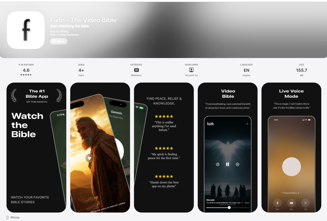 此外,fal 还提到了 AI Native Studios 的兴起,例如一款名为 Faith 的圣经应用程序,它利用 AI 制作高质量的圣经故事视频,在 App Store 上获得了极高的排名,这也证明了 AI 原生内容在垂直教育领域的吸引力。