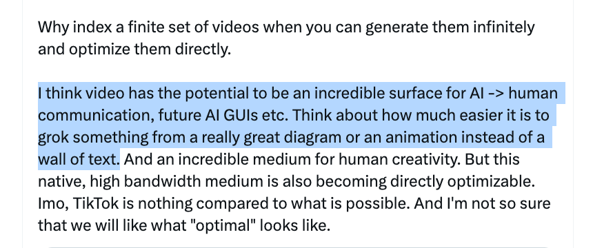 fal 进一步引用了 Andrej Karpathy 的观点来支撑自身对视频价值的深层理解:人类本质上是视觉动物,相比于阅读「文字墙」(Wall of Text),视频是一种信息压缩率更高、更符合人类直觉的媒介。