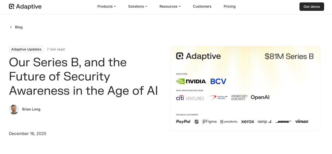 Adaptive Security 是一家由 Brian Long 和 Andrew Jones 于 2024 年创立的 AI 网络安全公司,专注于通过先进的 AI 技术提供下一代安全意识培训、AI 攻击模拟和实时风险分析,帮助组织防御如深伪(deepfake)、生成式钓鱼、语音/短信诈骗等复杂的社会工程类网络威胁。