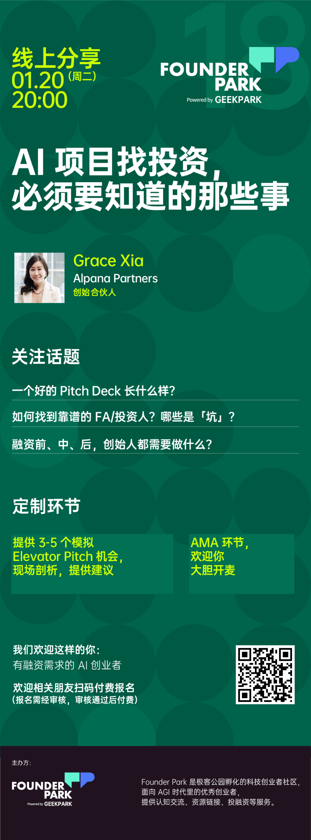 邀请到 Alpana Partners 联创 Grace Xia,围绕「AI 初创,怎么顺利拿到融资?」这个核心话题,来进行线上分享和实时交流。