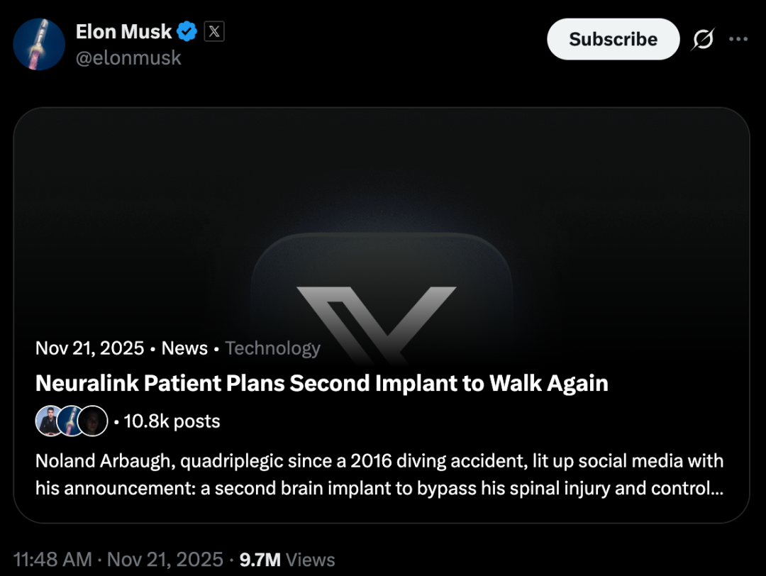 马斯克在社交媒体上亲口承认,Noland可能是第一个尝试「双芯片」的人选 。