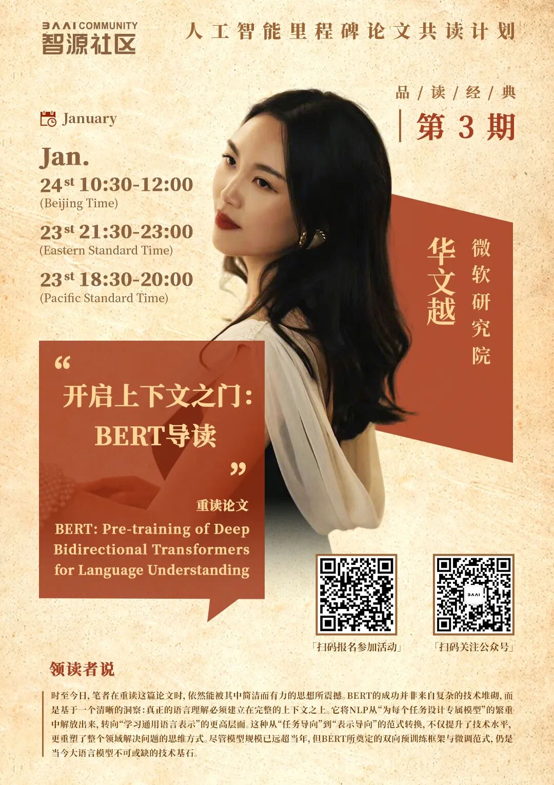 本期经典品读,我们荣幸地邀请到微软研究院AI前沿部门的高级研究员——华文越作为本次经典重读的领航人。她将带领我们深入解读NLP领域划时代的经典文献:《BERT: Pre-training of Deep Bidirectional Transformers for Language Understanding》。