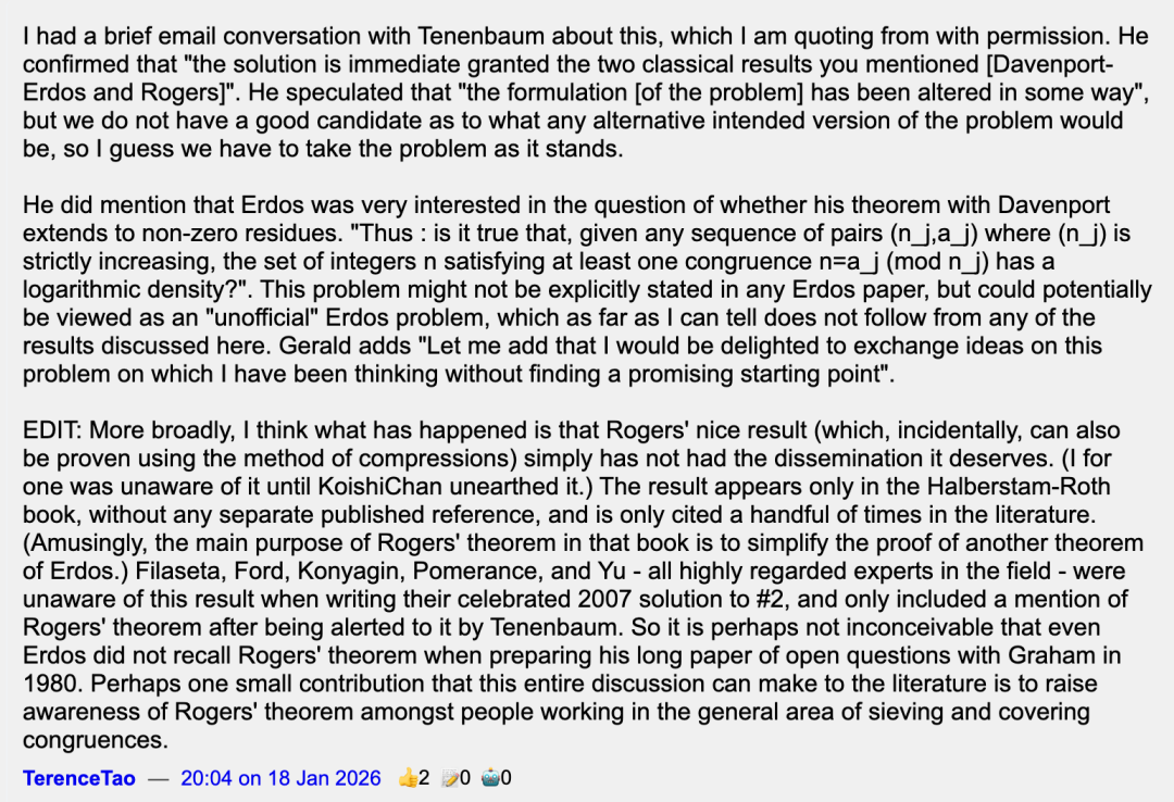 陶哲轩感慨:“罗杰斯定理没有得到它应有的传播。它只出现在哈尔伯斯塔姆-罗斯那本书里,没有单独发表,文献引用寥寥无几。或许这场讨论能让更多研究筛法和同余覆盖的人注意到这个结果。”