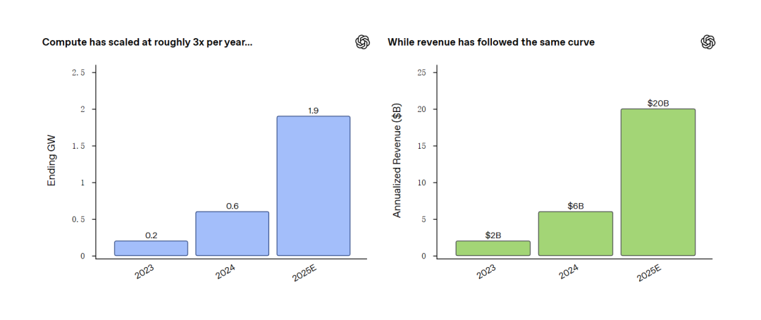 2023年:算力0.2GW,ARR(年化经常性收入)20亿美元 2024年:算力0.6GW,ARR 60亿美元 2025年:算力1.9GW,ARR超过200亿美元