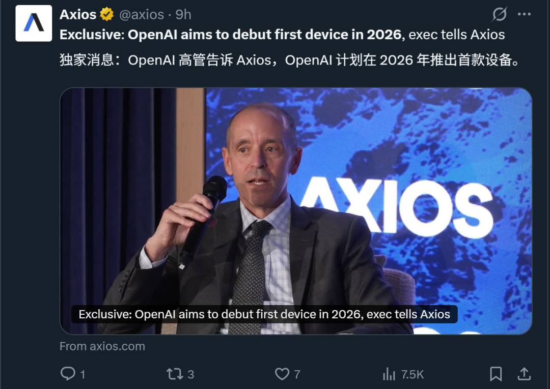 一位OpenAI高管表示,其首款设备很有可能在2026下半年推出。
