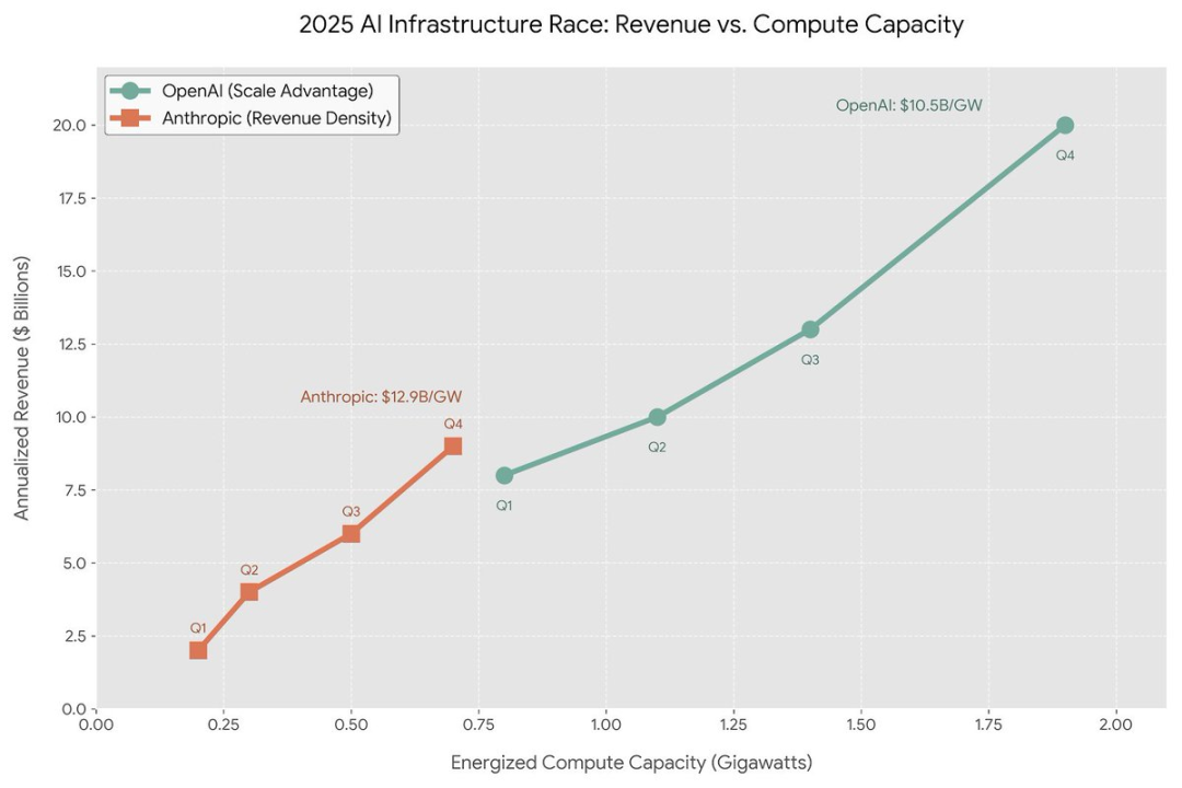 光看一家你可能没概念,那如果把OpenAI和它的“老对手”(Claude母公司)放一起呢: