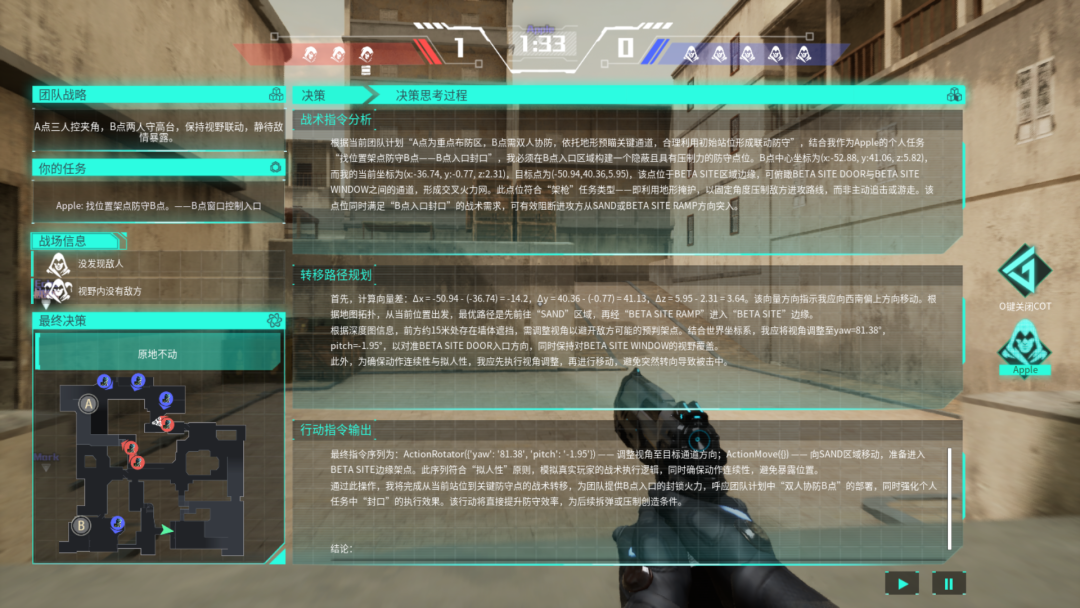 并非随机指令生成,而是基于当前局势进行宏观的因果推演,比如通过已知敌方三人在A点露头,可得出B点防守薄弱的结论。