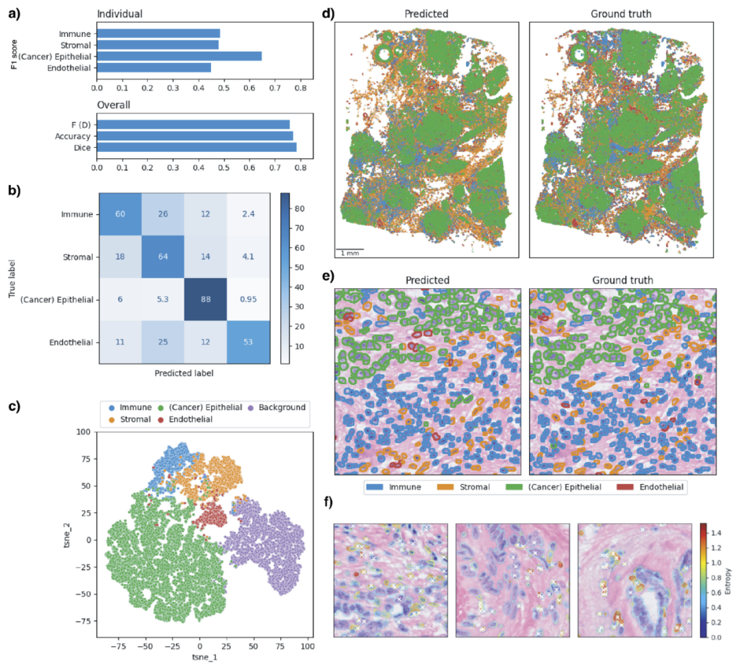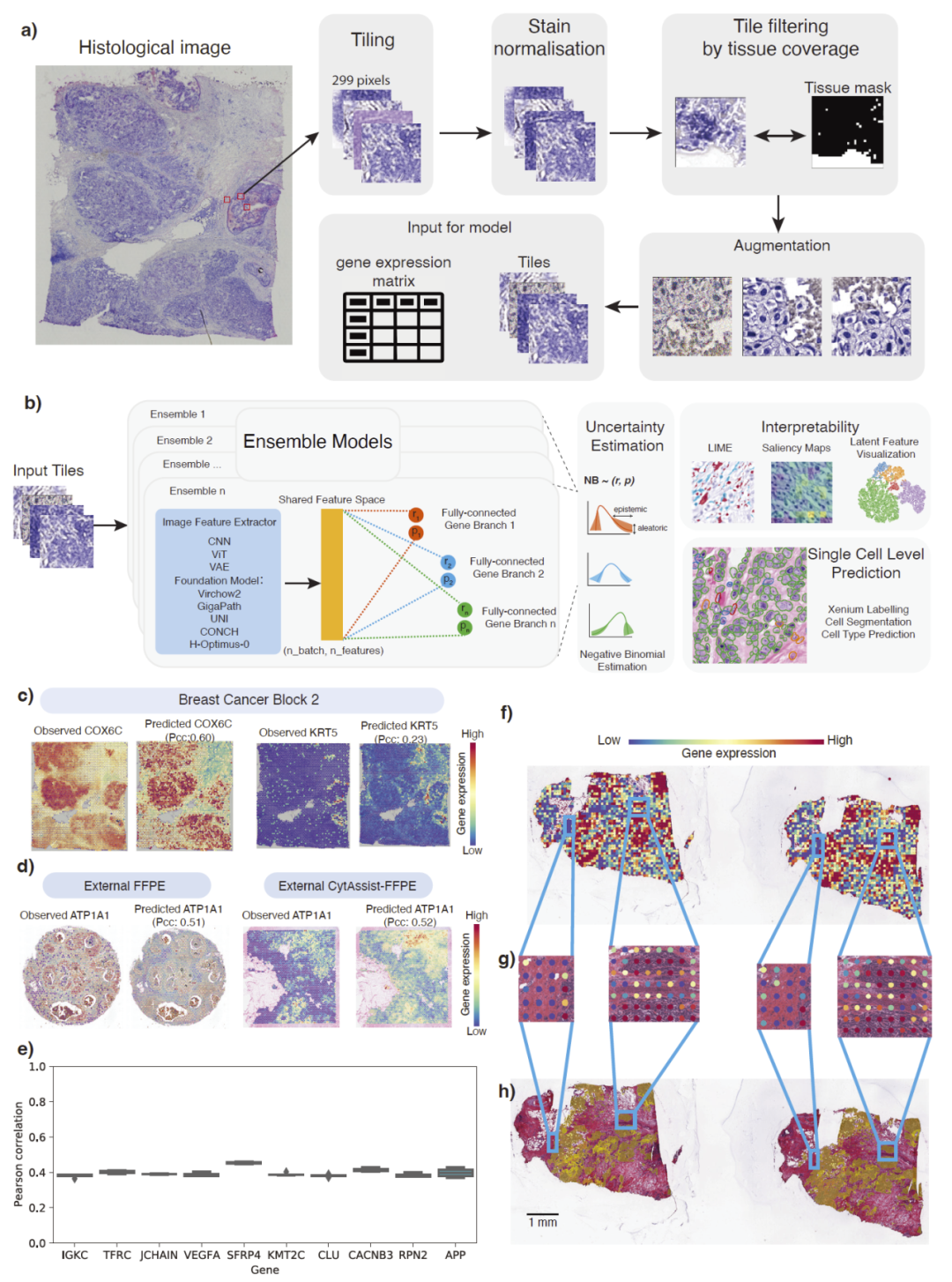 STimage 以空间转录组数据与对应的 H&E 图像作为训练输入,将组织图像切分为与空间测序位点对应的小块,并进行染色归一化和低组织覆盖区域过滤。模型利用预训练卷积神经网络或病理基础模型提取图像特征,并通过概率回归模块预测每个基因在空间位置上的表达分布,而非单一数值。同时,研究人员采用模型集成策略区分数据本身的不确定性与模型不确定性。在可解释性方面,STimage 结合核分割与局部可解释方法,在单细胞尺度上定位对基因预测贡献最大的组织结构。