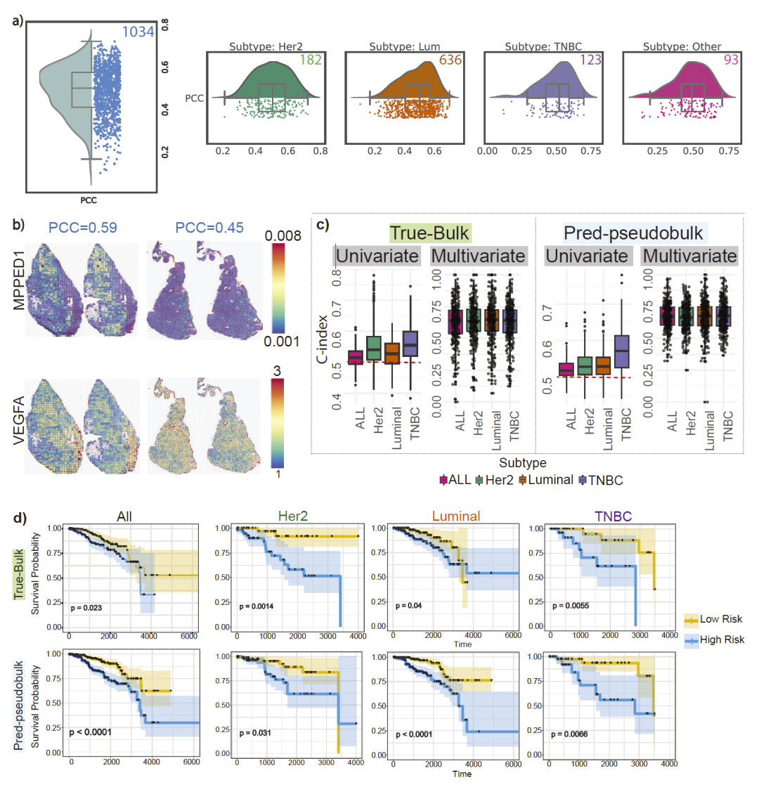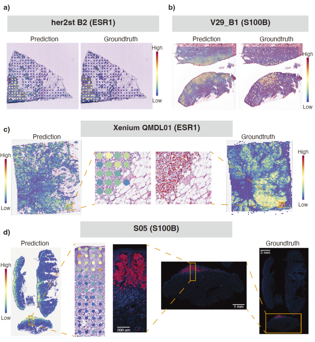 在乳腺癌等数据集中,STimage 对高表达与低表达基因均能重现真实的空间分布模式,预测结果在空间自相关指标上与实验测量高度一致。
