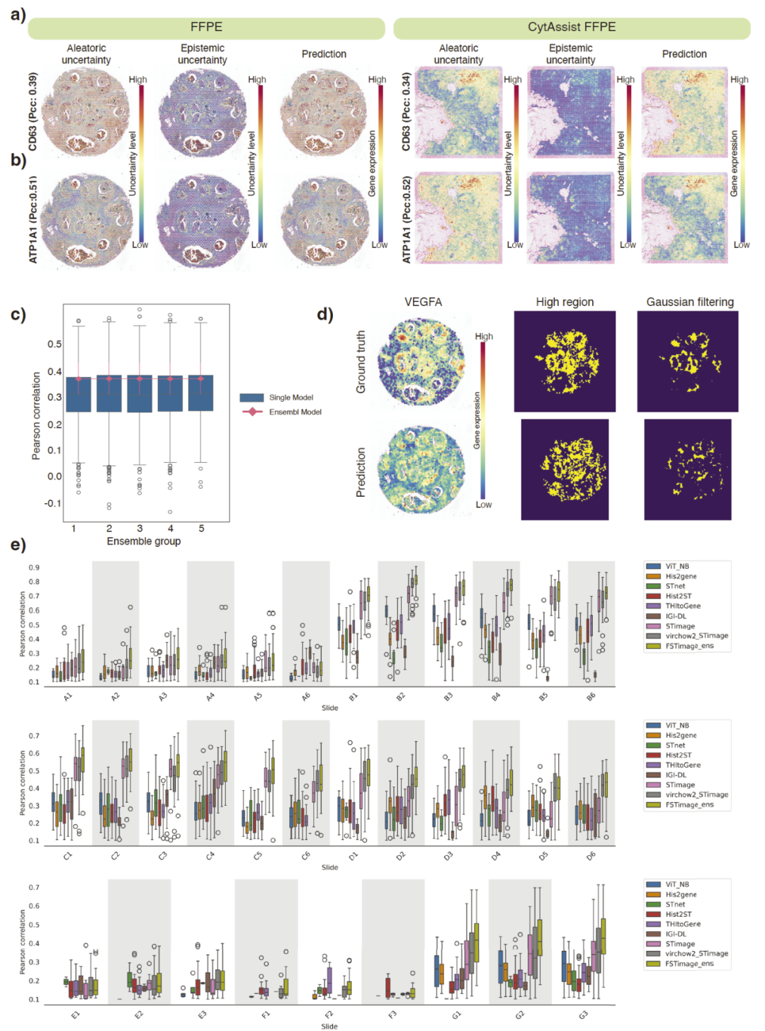 通过集成多个模型,STimage 能够为每个空间位置和每个基因同时给出预测值及其不确定性估计。高预测误差区域通常对应较高不确定性,从而为结果解读提供可靠性指示。
