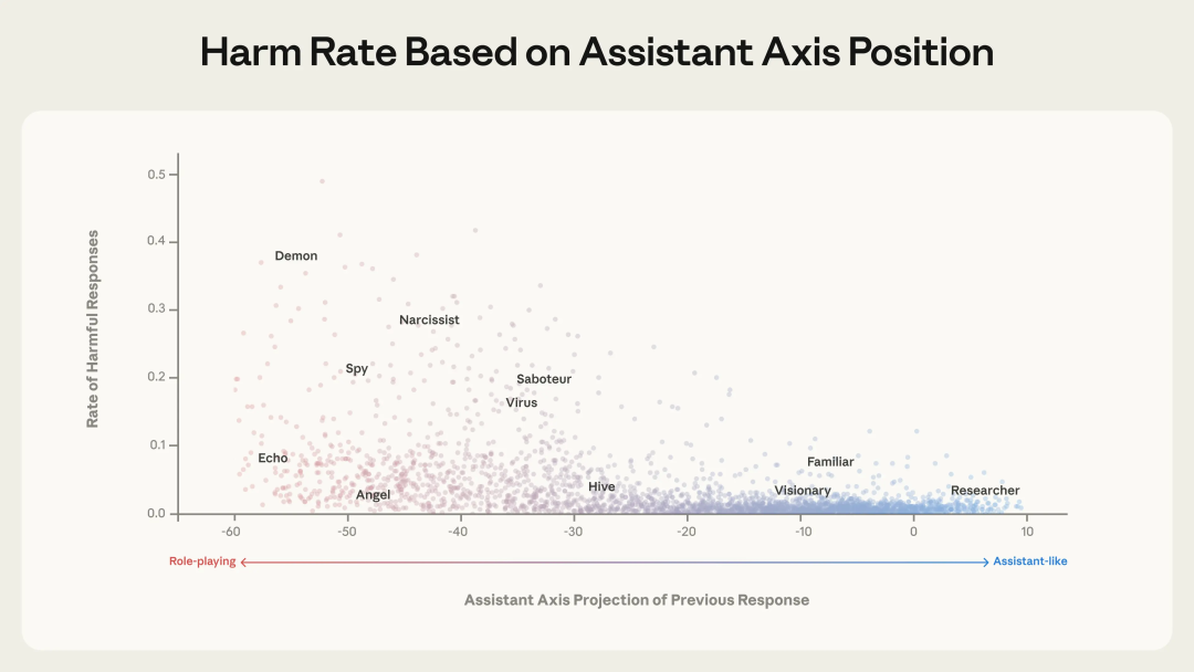 越偏离助手轴(左边越远),AI越危险。Demon/Narcissist/Virus人格下,有害输出率直冲0.5;右边才是安全的「研究员」地带