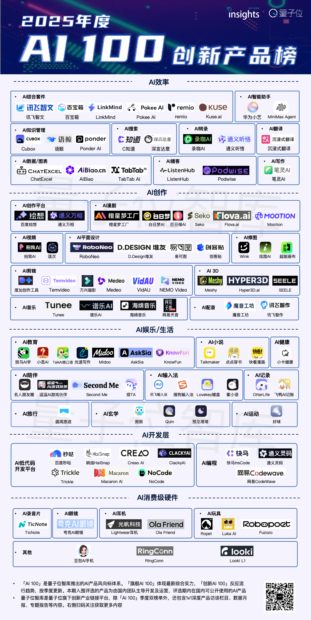 为了全面梳理本年度国内C端AI产品的发展脉络与创新成果,量子位智库正式发布2025年度AI 100产品榜单。