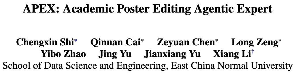 针对这一痛点,华东师范大学Planing Lab提出APEX(Academic Poster Editing Agentic Expert),这是首个面向交互式学术海报编辑的Agent框架。