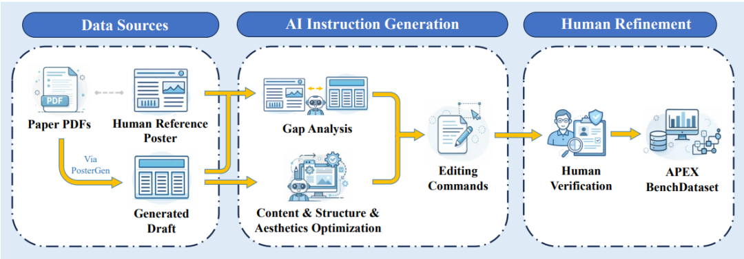 为模拟真实编辑场景并系统评估学术海报自动编辑能力,团队通过参考导向与无参考优化两种方式构建了首个学术海报编辑基准测试APEX-Bench,该基准覆盖 59 篇 ICLR、ICML、NeurIPS 顶级会议论文,对应514条具有4种难度梯度的编辑指令,涵盖文本内容修改、风格调整、图像编辑与布局重构等多种操作类型。
