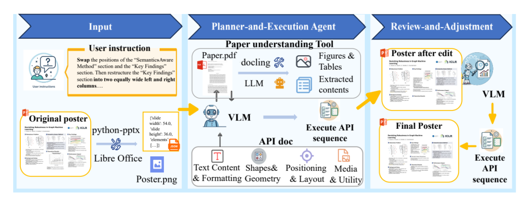 为了解决上述问题,APEX执行多层级的API序列来增量式编辑学术海报,并引入「审查-调整」机制调整初次编辑的结果,提高编辑的准确度。