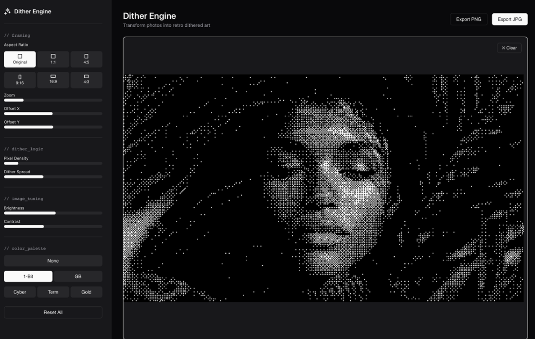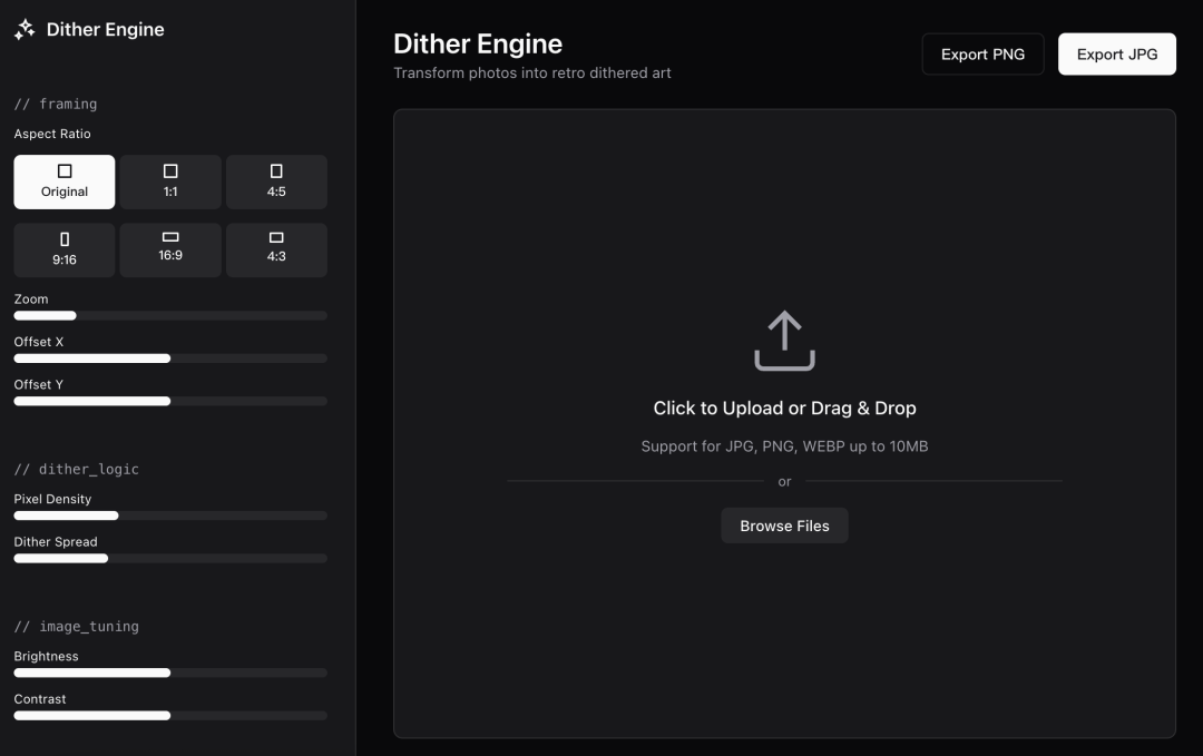 通过像在Figma里一样手动调整细节,搭建了由左侧的参数面板和右侧预览区组成的Dither Engine图片编辑工具。