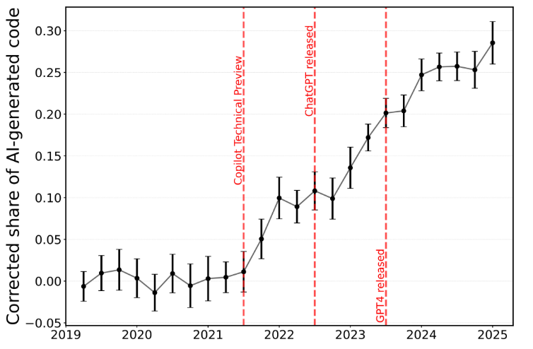 研究发现,截至 2024 年底,美国已有约 29% 的 Python 函数被标记为 AI 生成或辅助完成。这一比例并非匀速上升,在 GitHub Copilot 预览版推出、ChatGPT 公开上线,以及 GPT-4 等大模型发布这几个关键节点后,AI 生成代码的占比都出现了陡峭的跃升。