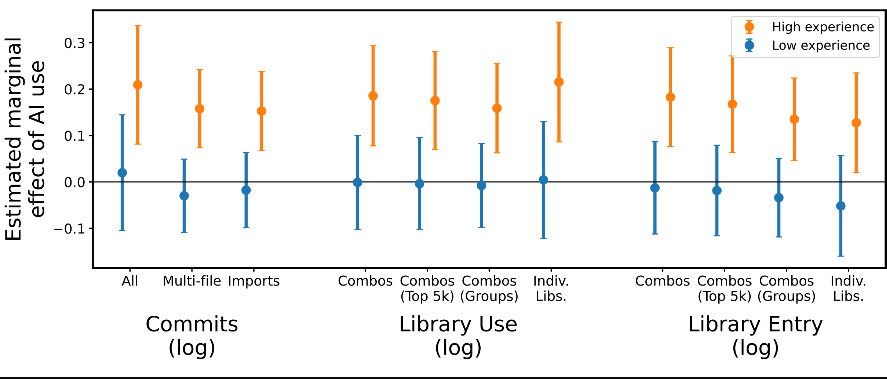 在资深开发者群体中,将 AI 使用率提升至 29%,会带来高达 6.2% 的代码提交量增长,其效果远超行业平均水平。更重要的是,AI 帮助他们更轻松地使用不熟悉的软件库和新技术组合,这意味着他们能更快地进入新领域、尝试新方案。因此,AI 不仅让他们做得更快,更让他们做得更广,实质性地扩展了创新的边界。