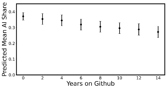 图|按用户 GitHub 使用年限划分的生成式 AI 使用强度(2024 年,美国)。