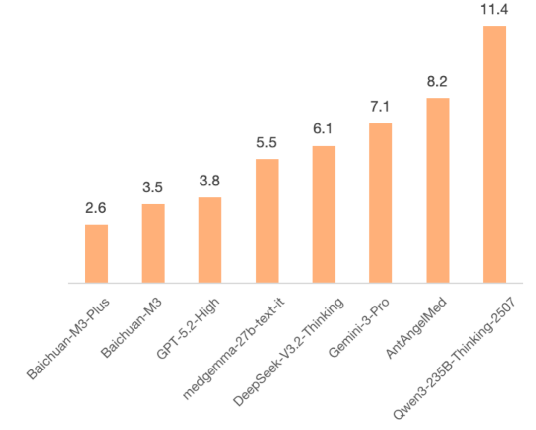 这个幻觉率水平,已经低于目前业内公认的标杆产品水平,也低于部分人类医生在复杂医学问题上的平均误判率区间。