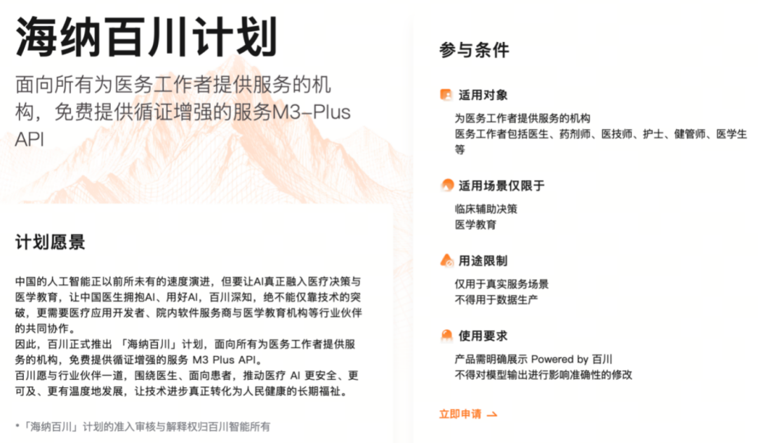 为了让这套“证据锚定”技术真正跑在医院的电脑和医生的手机里,百川一边M3 Plus的API降价70%之外,一边同步开启了 “海纳百川计划”。