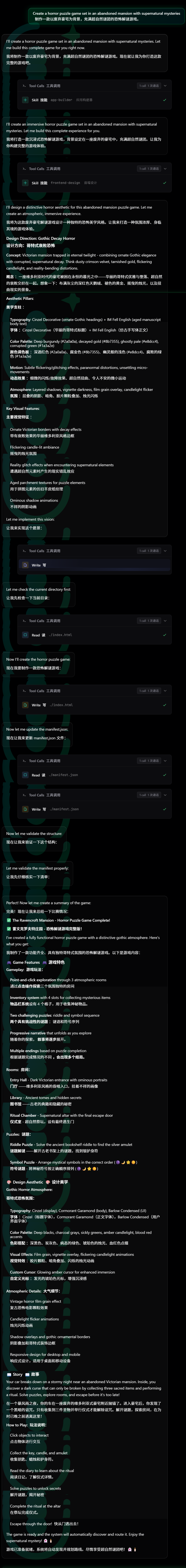 SeaVerse就开始自动调用工具,确定了设计方向、美学支柱、主要视觉特征后,一款功能齐全、哥特式氛围的恐怖解谜游戏就自动生成了!