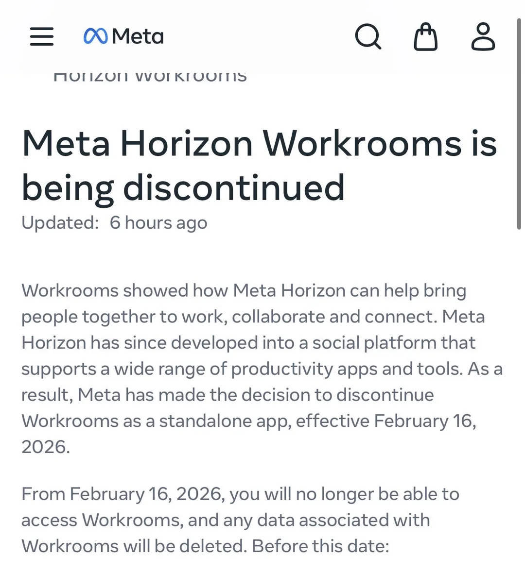 2026年1月16日,Meta在帮助页面上低调写下另一行字:Horizon Workrooms将于2月16日关闭,数据删除。