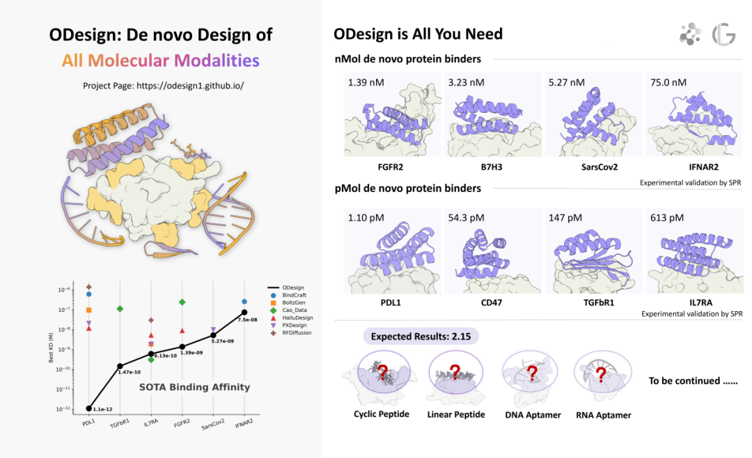 早期结果。团队利用ODesign-pipeline在 8 个靶点 上完成了一轮 mini-protein 设计,其中4个靶点的最优 binder 已达到 pM 量级。后续实验结果将陆续产出,感谢大家的持续关注,也欢迎进一步交流与合作。