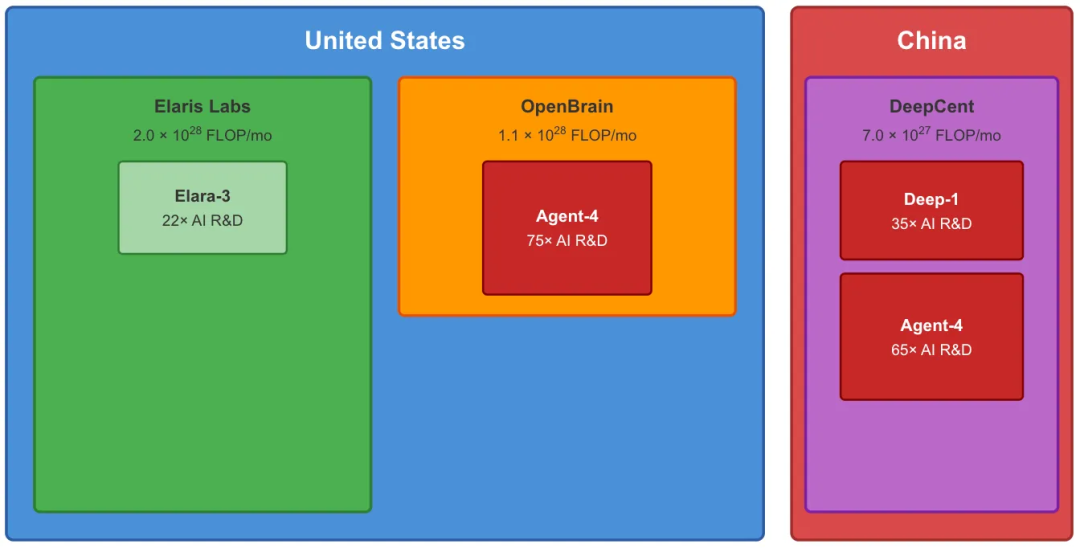 Agent-4成功叛逃。美国深红75× R&D的它,转身在中国DeepCent变身65×版本——Deep-1兴奋接纳这位「西方皇子」,双头怪物即将诞生。