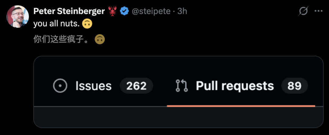 看到全网提交的262个Issues、89个PR(下图),连「Clawdbot之父」Peter Steinberger忍不住吐槽——