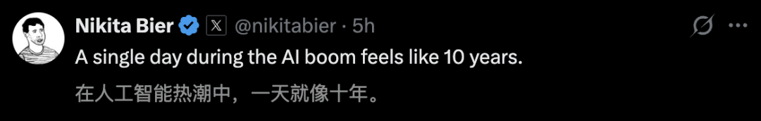 甚至,xAI产品负责人Nikita Bier感慨道,「AI这波浪潮,一天就低十年」。