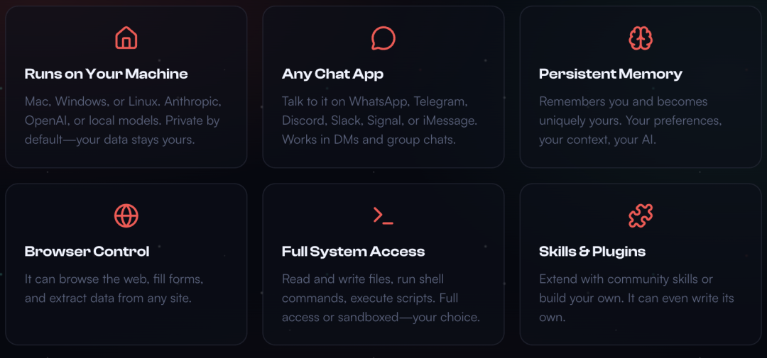它具备持久的自主性,能够自主执行任务并自我提升;它支持多智能体系统,可以根据需求瞬间克隆出整个部门;保证了本地控制与隐私。