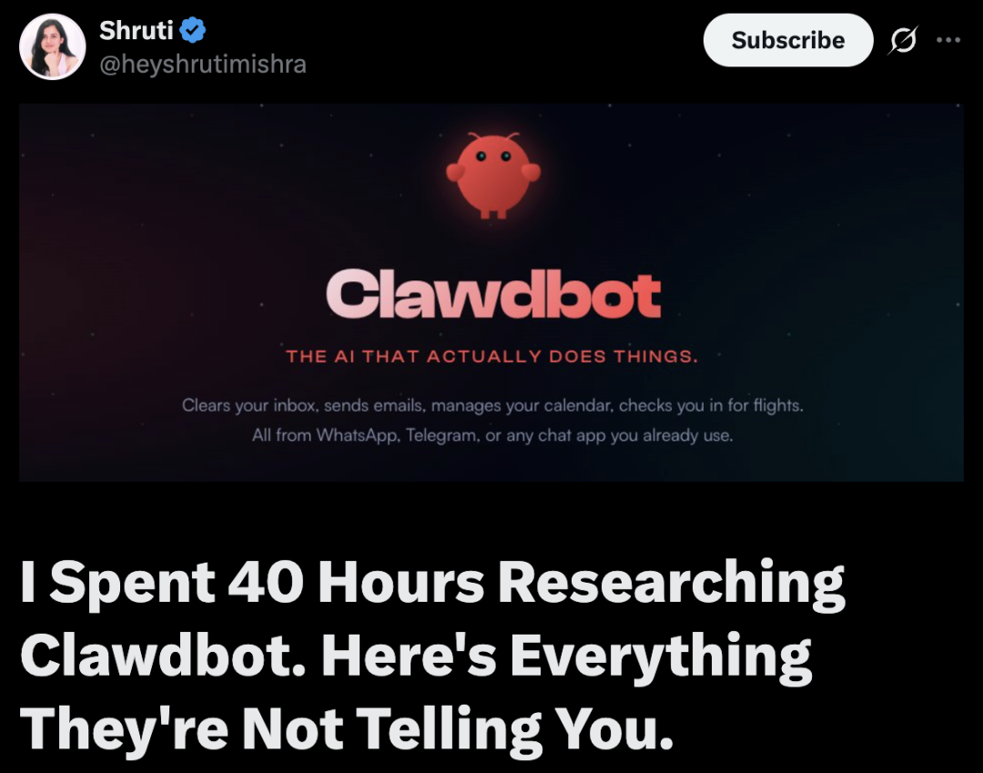 这一步,开发者Shruti花了40个小时深度调研了Clawdbot,一口气讲透了这款红遍硅谷半边天的AI的背后技术。