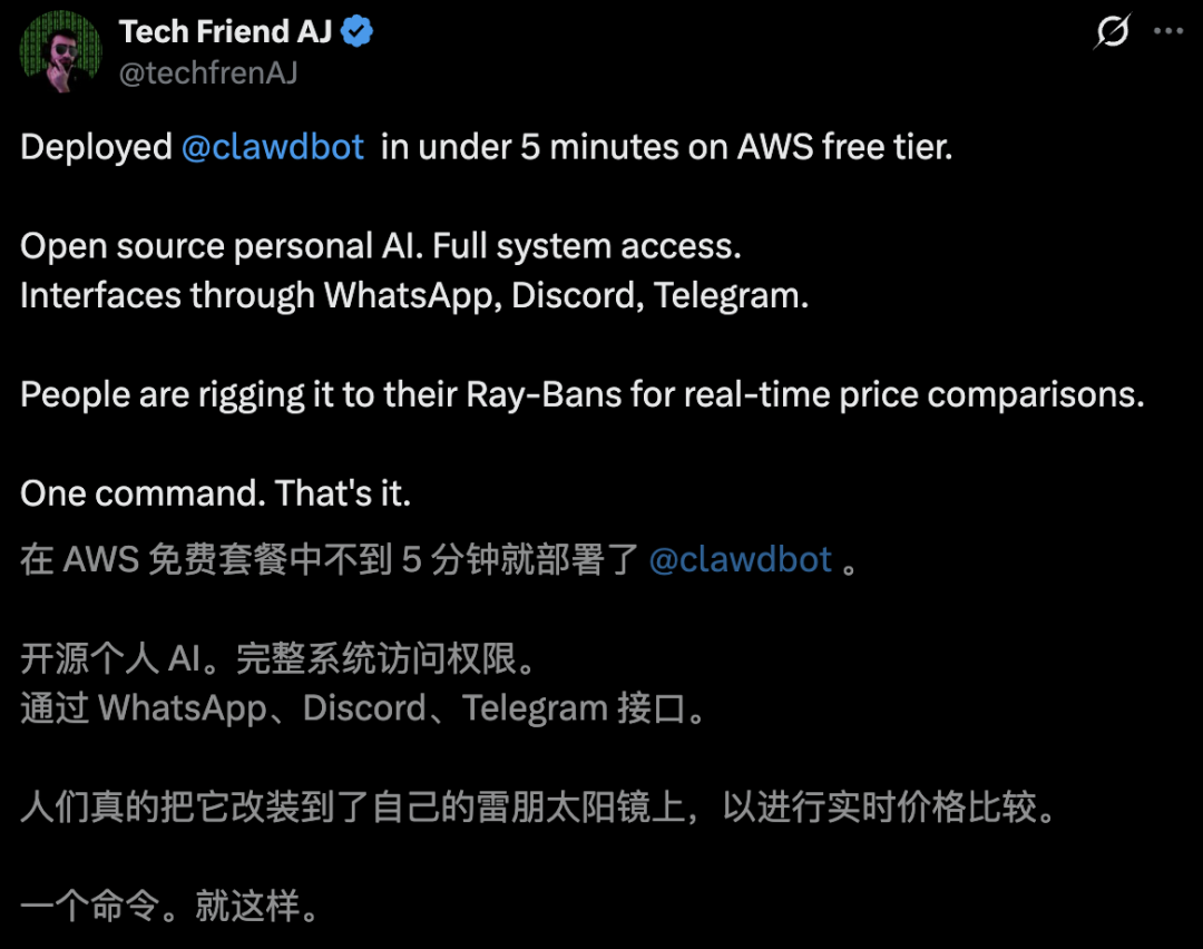 一位软件工程师在AWS上,仅用5分钟免费部署了Clawdbot。有人还将其装在AI眼镜上,用来实时价格比价。