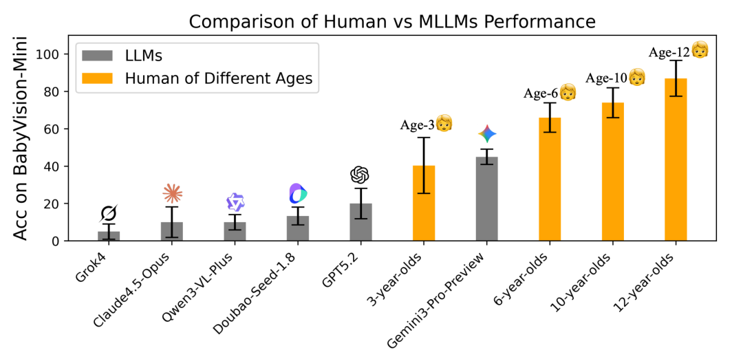 图|不同年龄段人类及 MLLM 在 BabyVision 上的表现对比。