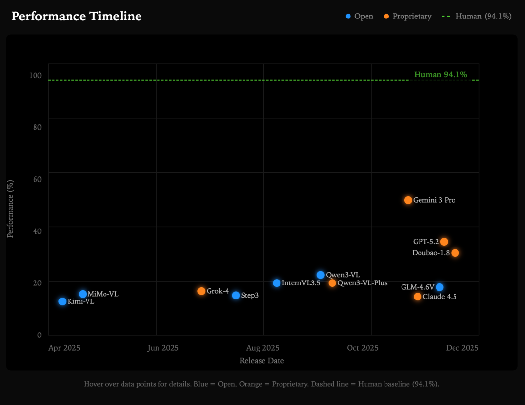 评测发现,GPT-5.2 的整体表现甚至不如人类 3 岁儿童,而当前最强模型 Gemini3-Pro-Preview,也未达到 6 岁儿童的平均水平。