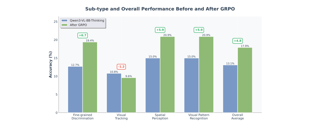 结果 RLVR 确实让模型在 BabyVision 上的整体准确率提升了 4.8%。然而,在 “视觉追踪”(Visual Tracking)这一类别上,RLVR 微调几乎没有带来任何提升,甚至出现了负增长。