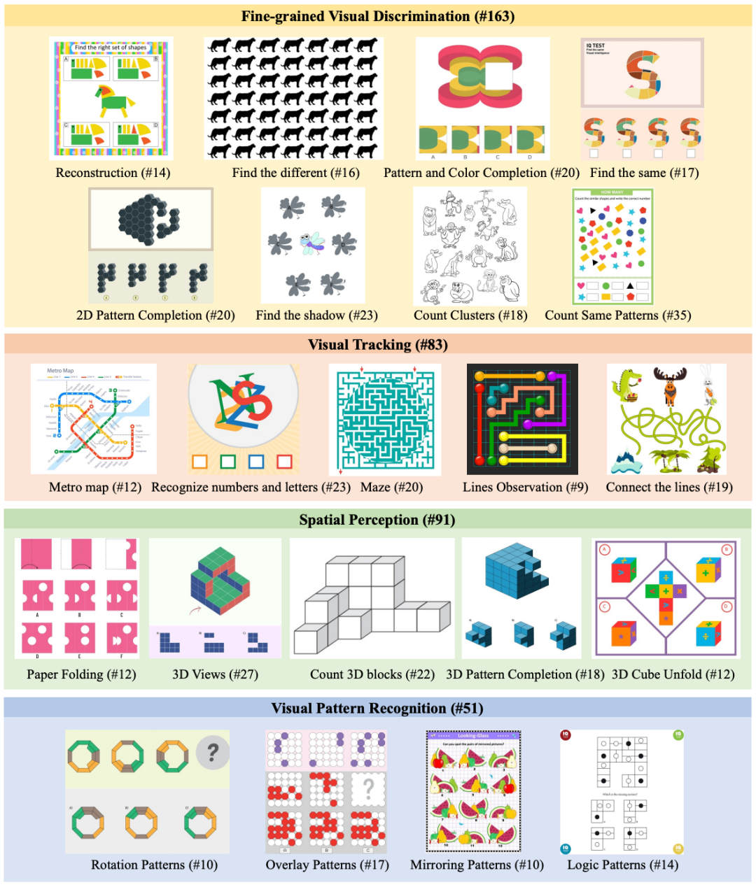 为了公平地测试 AI 的“视觉本能”,研究团队从发展心理学出发,刻意减少了 BabyVision 对文字知识的依赖,通过严格的数据整理流程,每张候选图像都由经过培训的标注员进⾏⼈⼯标注,最终题目包含 388 个精⼼挑选的问题,每个问题都与⼀张图⽚配对,涵盖以下四大核心视觉能力: