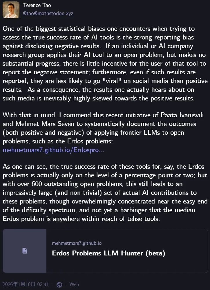 当然,陶哲轩也反复强调,这些被AI快速解决的Erdős问题多属于「最低垂的果实」——可以用标准工具、只是之前没人费心去组合的那一类。